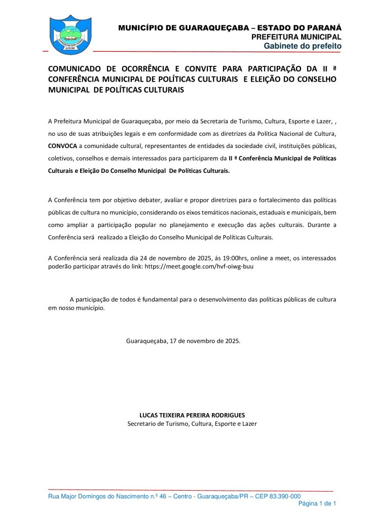 COMUNICADO DE OCORRÊNCIA E CONVITE PARA PARTICIPAÇÃO DA II ª CONFERÊNCIA MUNICIPAL DE POLÍTICAS CULTURAIS E ELEIÇÃO DO CONSELHO MUNICIPAL DE POLÍTICAS CULTURAIS