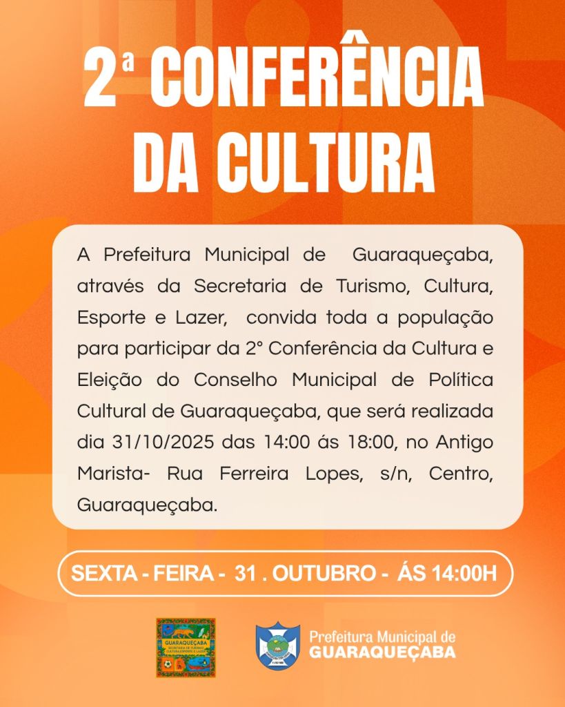 A Prefeitura Municipal de Guaraqueçaba ,através da Secretaria de Turismo,Cultura,Esporte e Laser,convida toda a população para participar da 2ª Conferência da Cultura.