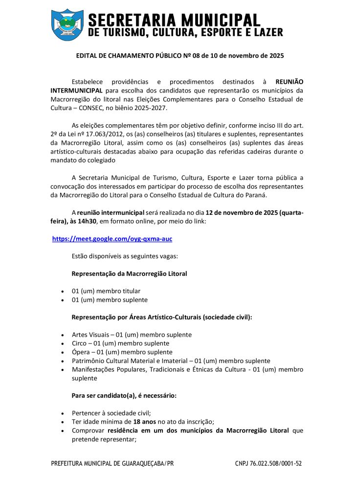Estabelece providências e procedimentos destinados à REUNIÃO INTERMUNICIPAL para escolha dos candidatos que representarão os municípios da Macrorregião do litoral nas Eleições Complementares para o Conselho Estadual de Cultura – CONSEC, no biênio 2025-202